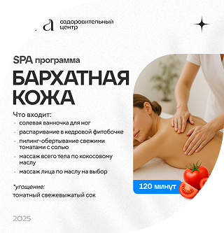 Мечтаете о коже, словно лепесток розы, невероятно мягкой, гладкой и сияющей? Наша уникальная SPA-программа "Бархатная КОЖА" создана для того, чтобы воплотить вашу мечту в реальность! Этот 120-минутный ритуал основан на целебных свойствах свежих томатов и подарит вашей коже нежность, бархатистость и восхитительный ухоженный вид.